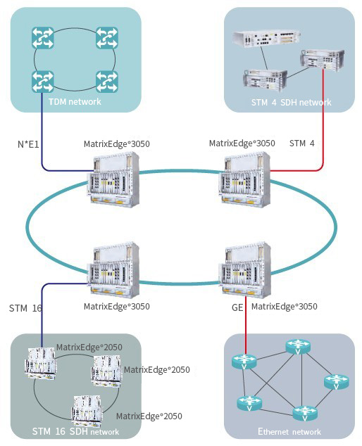 MatrixEdge3050可提供点对点、链路、环网、T型、多环等组网方式,可单独组成链路、环形、星形、树形、环切环、环相交、网孔网等网络。