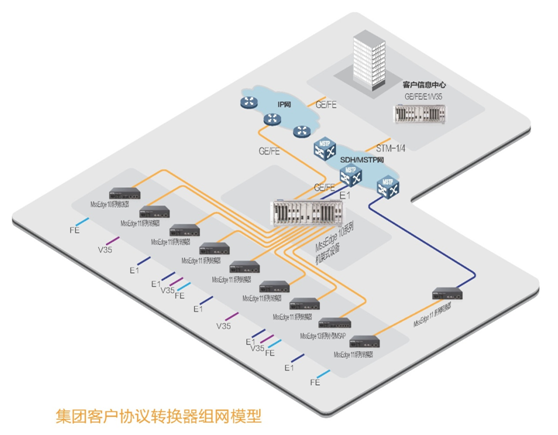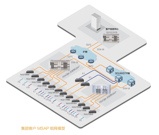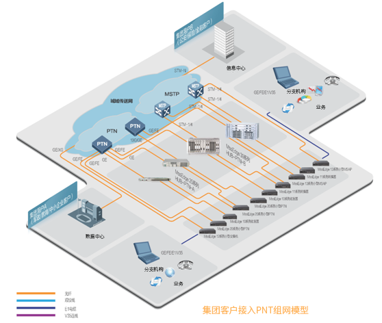 采用OPTEL接入型PTN、MSAP、协议转换设备,解决了集团客户数据通信、互联网接入、语音通信的需求。